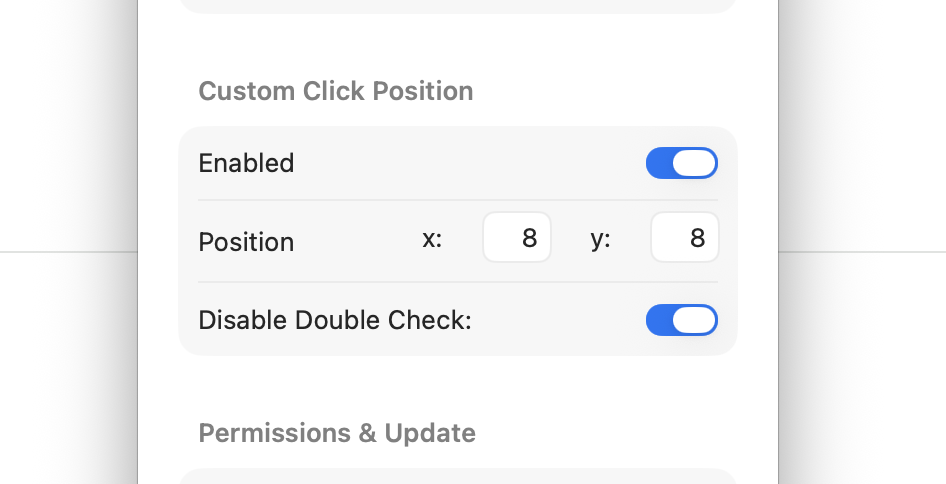Starting from v1.0.14, you can configure the click position and choose whether to run the double check. This is specifically for Tahoe, as the click position appears to have changed. Below is a configuration that works well on version 26.2: